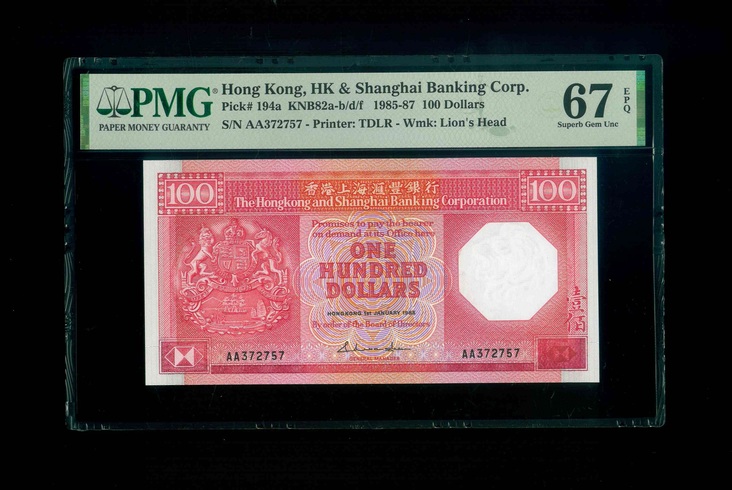 1985 香港上海滙豐銀行 $100 PMG 67 EPQ 編號:AA372757(頭版系列,頂級雪白)