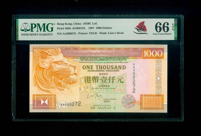 1997 香港上海滙豐銀行 $1000 PMG 66 EPQ 編號:AA390272(頭版系列,頂級雪白)