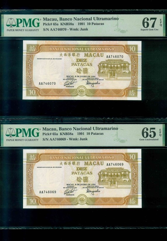 1991 澳門大西洋銀行 10 Patacas PMG 65 EPQ 編號:AA746069-70(共2張,頭版連號,頂級雪白)