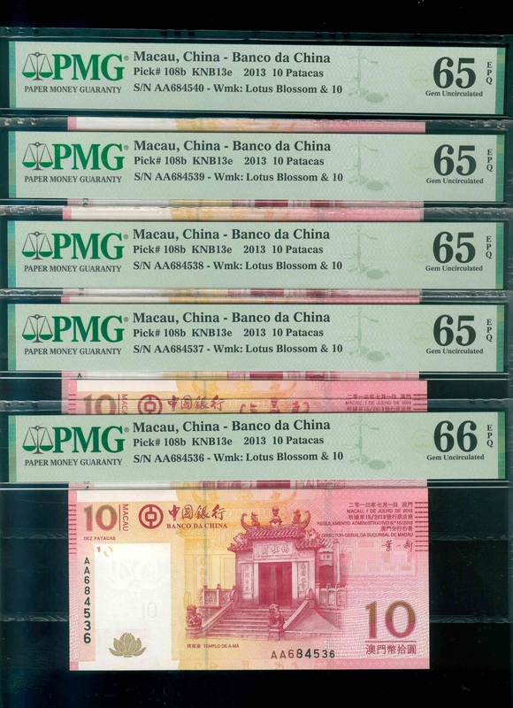2013 澳門中國銀行 10 Patacas PMG 65-66 EPQ 編號:AA684536-40(共5張,頂級雪白)