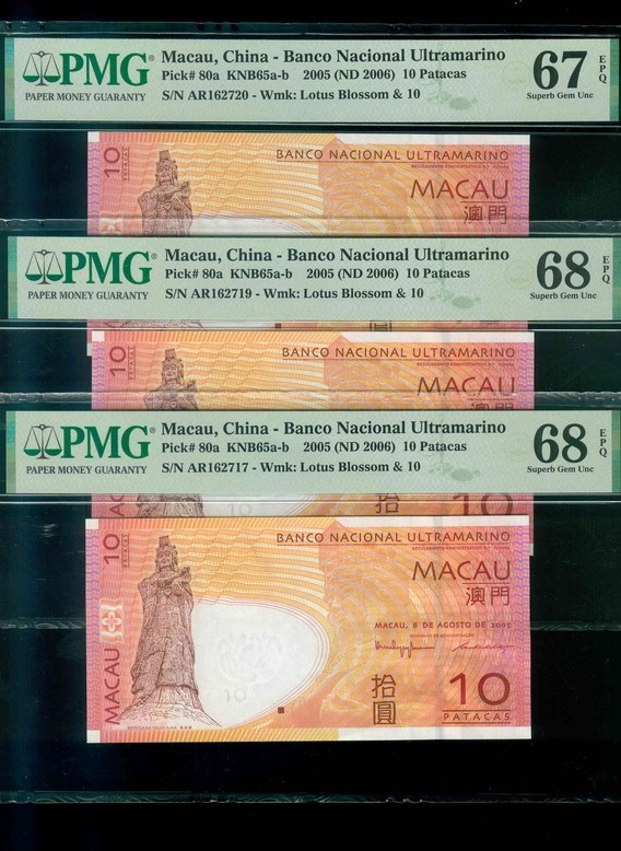 2005 澳門大西洋銀行 10 Patacas PMG 67-68 EPQ 編號:AR162717…(共3張,含連號,頂級雪白)