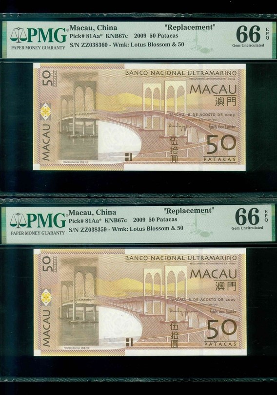 2009 澳門大西洋銀行 50 Patacas PMG 66 EPQ 編號:ZZ038359-60(共2張,補版連號,頂級雪白)