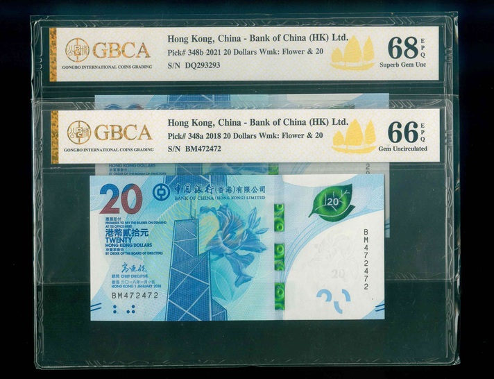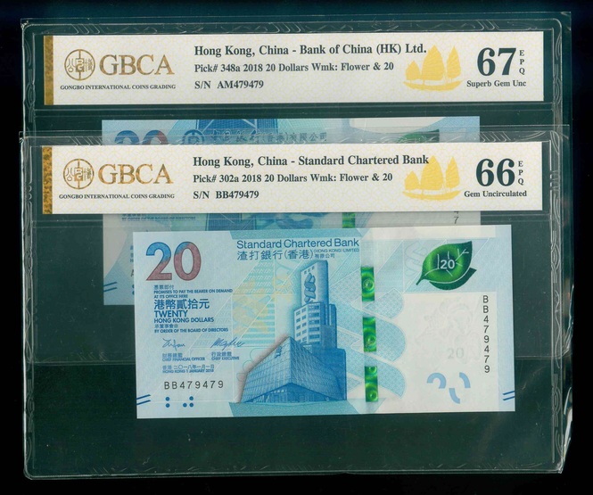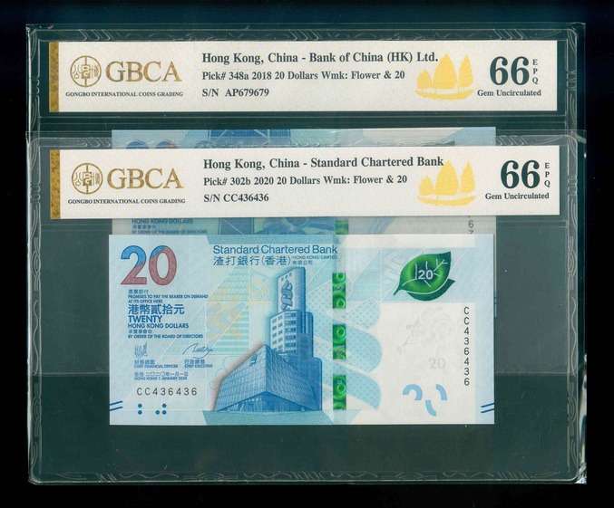 2020/2018 香港渣打/ 中國銀行 $20 GBCA 66 EPQ 編號:CC436436…(共2張,含雙冠/重複號,頂級雪白)