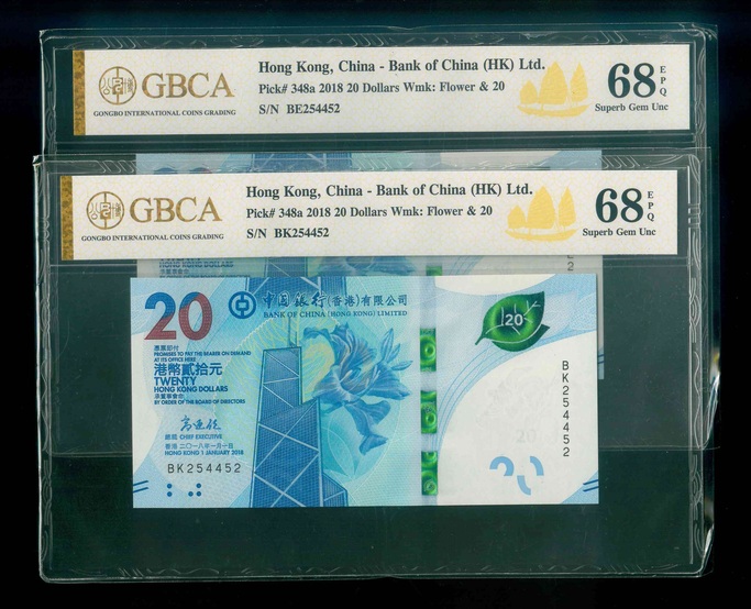 2018 香港中國銀行 $20 GBCA 68 EPQ 編號:BK/BE 254452(共2張,雷達同號,頂級雪白)