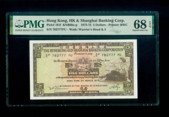 1975 香港上海滙豐銀行 $5 PMG 68 EPQ 編號:782777 FU(豹子號,頂級雪白)