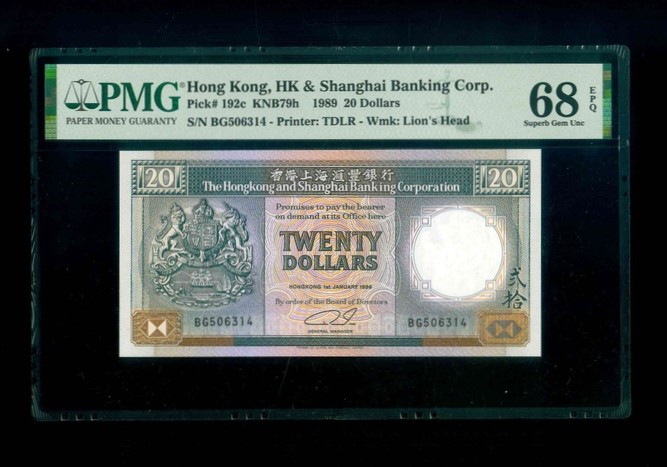 1989 香港上海滙豐銀行 $20 PMG 68 EPQ 編號:BG506314(頂級雪白)