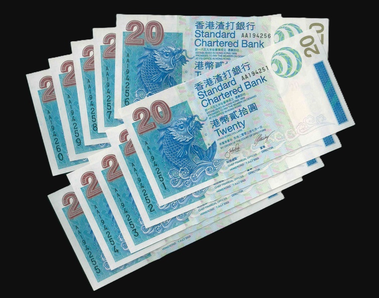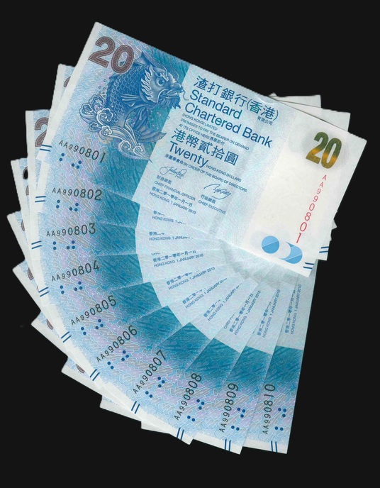 2010 香港渣打銀行 $20 UNC 編號:AA990801-10(共10張,頭版連號,頂級雪白)
