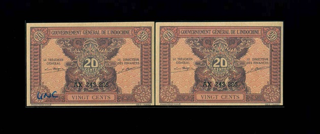 1942 日佔法屬印度支那 20 Cents UNC 編號:AX 243.226(共2張,同號)