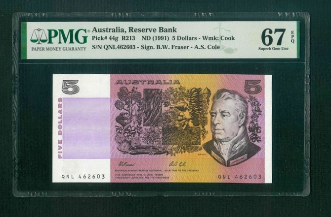 1991ND 澳洲 $5 PMG 67 EPQ 編號:QNL 462603(頂級雪白)