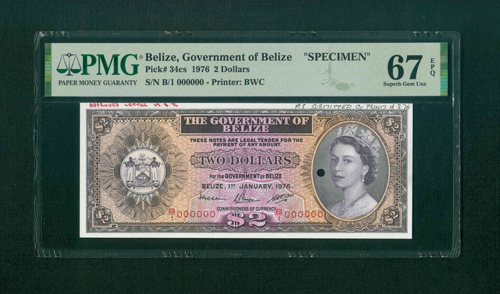 1976 伯利滋 $2 PMG 67 EPQ 編號:B/1 000000(樣票,冠軍分,頂級雪白)