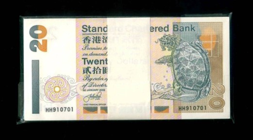 2002 香港渣打銀行 $20 UNC 編號:HH910701-800(標準百連)