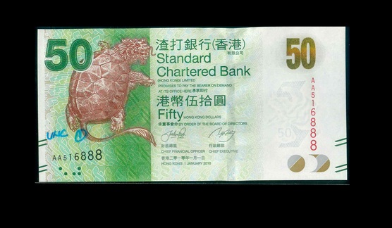 2010 香港渣打銀行 $50 UNC 編號:AA516888(頭版豹子,頂級雪白)
