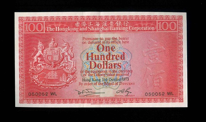 1973 香港上海滙豐銀行 $100 AU 編號:050052 WL(原裝美品)