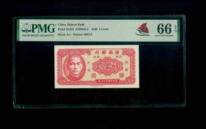 1949 海南銀行 伍分 PMG 66 EPQ 編號:AA(頂級雪白)