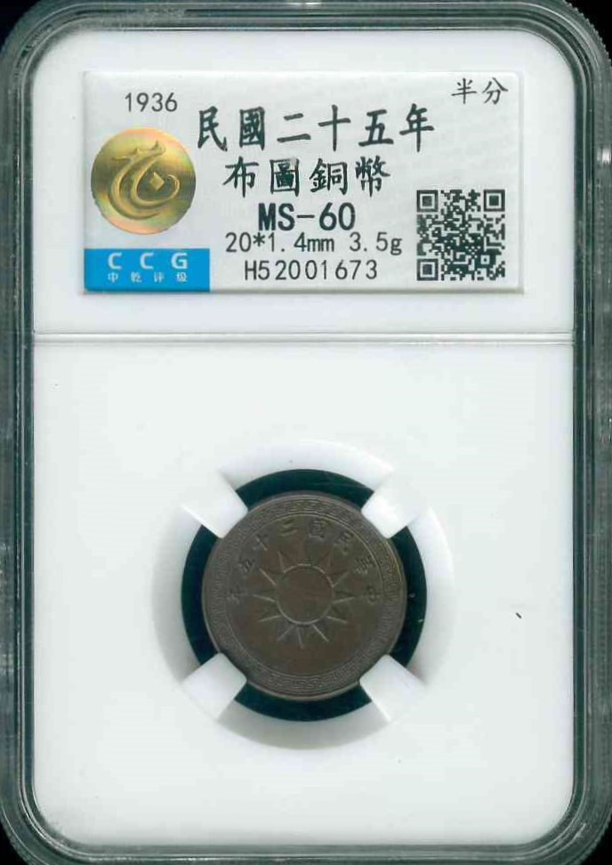 1936 民國25年布圖銅幣 CCG MS60 編號:H52001673[非公博評級,自行判斷,售後不退]