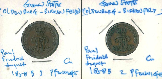 1858 德國 (Oldenbourg Birkenfeld) 2,3 Pfennig VF 編號:NIL(共2枚)