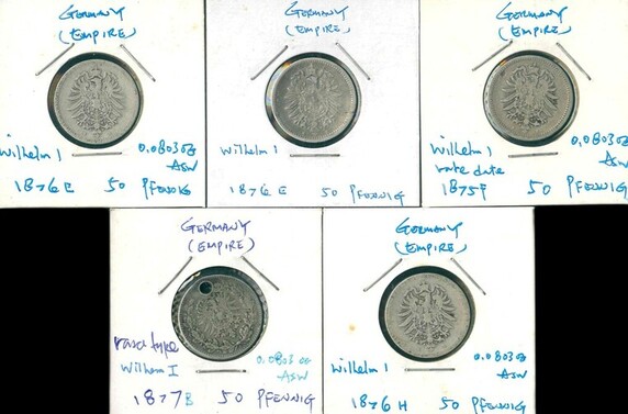1875F-1877B 德國 (Empire) 50 Pfennig 早期 (Hole) F/VF 編號:NIL(共5枚)