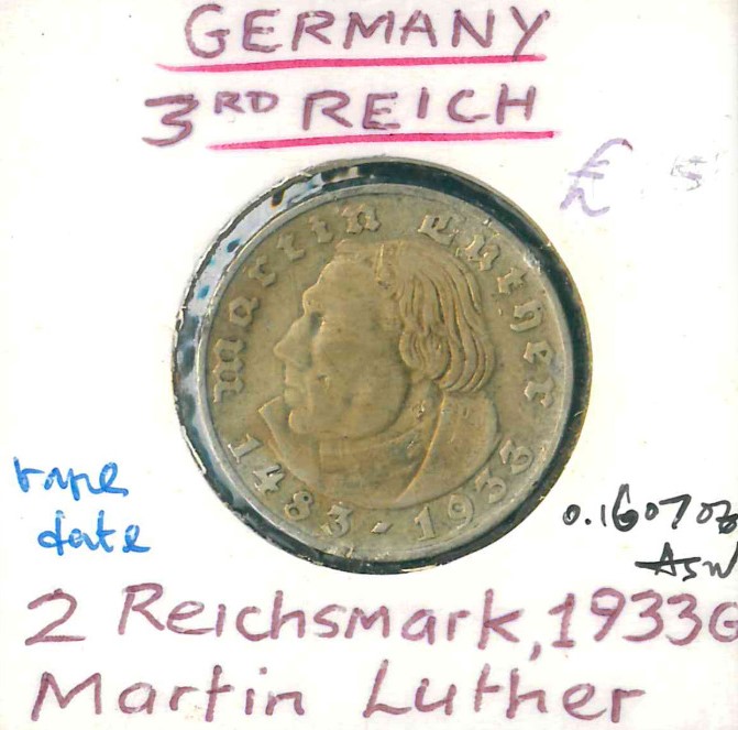 1933G 德國 (3rd Reich-Martin Luther) (2rd Reichsmark) XF 編號:NIL