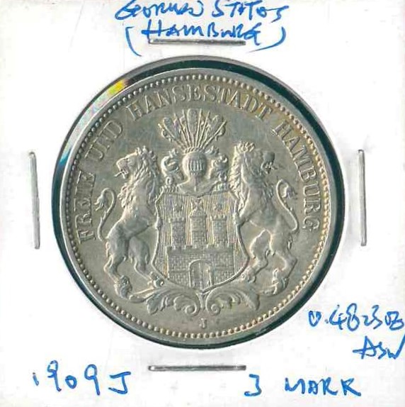 1909J 德國 (Hambourg) 3 Marks XF+ 編號:NIL