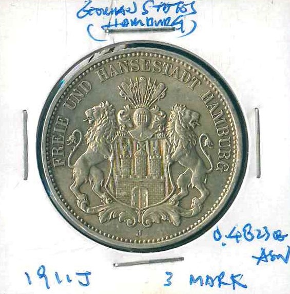 1911J 德國 (Hambourg) 3 Marks AU 編號:NIL