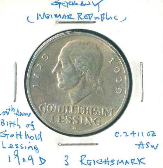 1929D 德國 (Weimar-Gotthold Lessing) 3 Reichsmark AU 編號:NIL