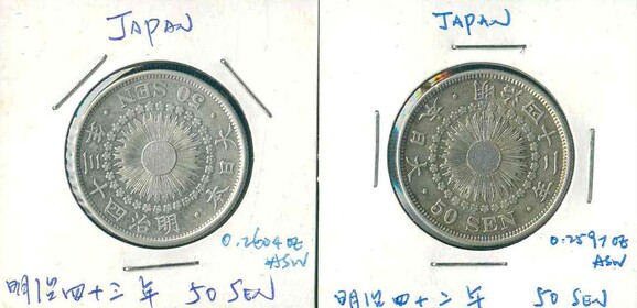 1909-10 日本明治42,43年50錢 (0.2597/0.2604oz Asw) XF 編號:NIL(共2枚)