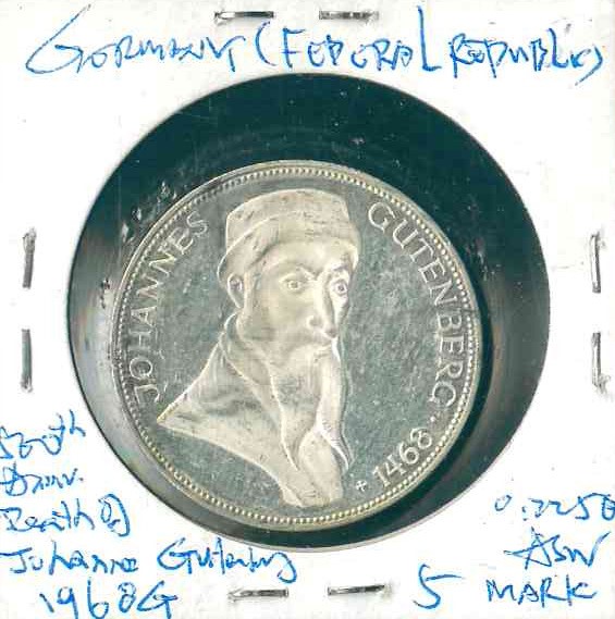 1968G 德國(聯邦共和國) 5 Mark (0.25oz Asw) UNC 編號:NIL