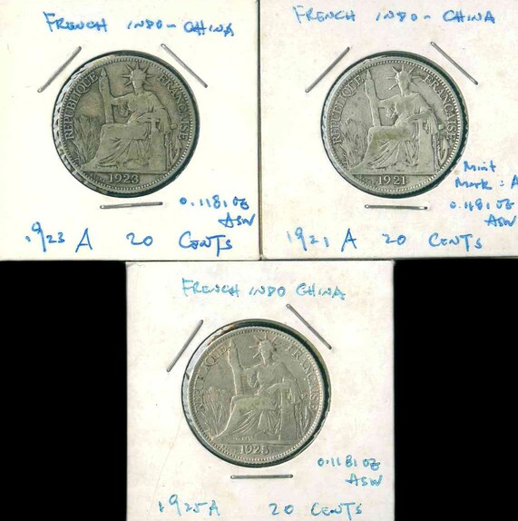 1921A-1925A 法屬印度支那 20 Cents (0.1181oz Asw) VF/F 編號:NIL(共3枚)