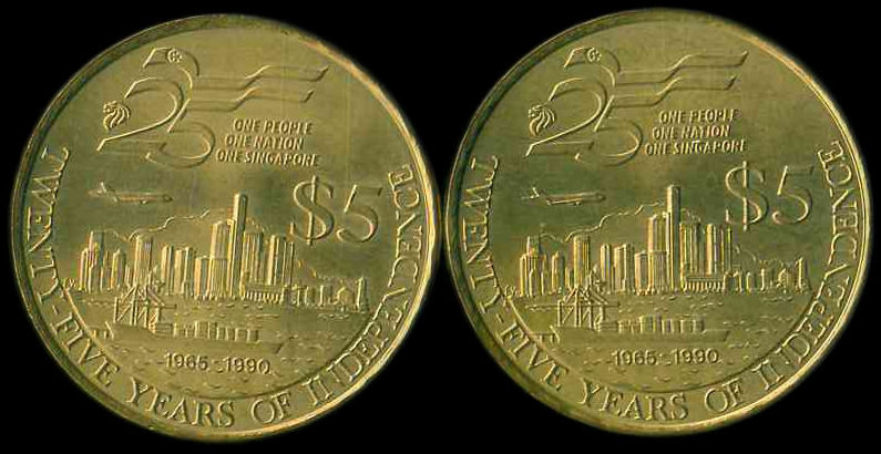 1990 星加坡獨立25周年紀念鋁青銅幣 $5 品相如圖 編號:NIL(共2枚,原裝套)