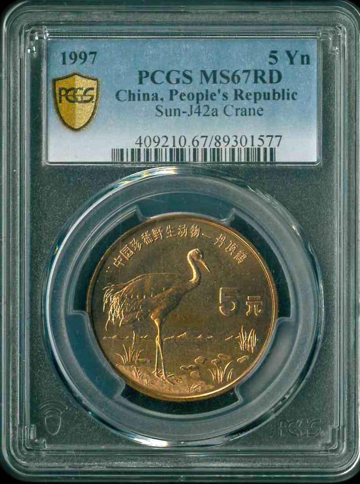 1997 中國珍稀野生動物(丹頂鶴) $5 PCGS MS67RD 編號: 89301577