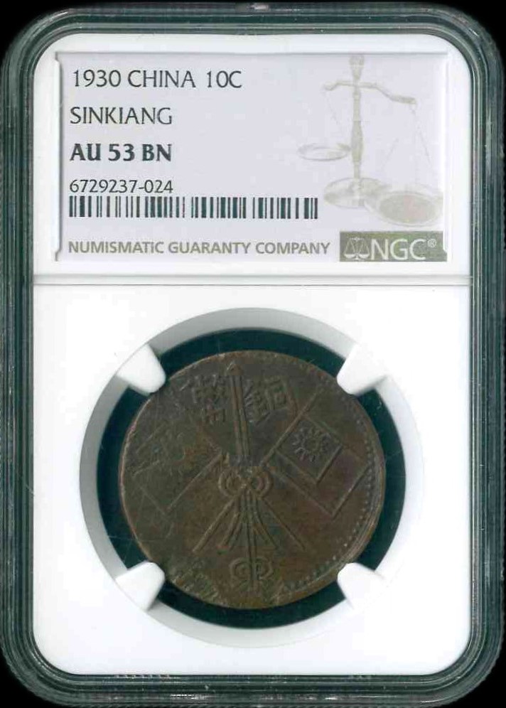 1930 新彊喀什造庚午十文銅幣 NGC AU53BN 編號: 6729237-024