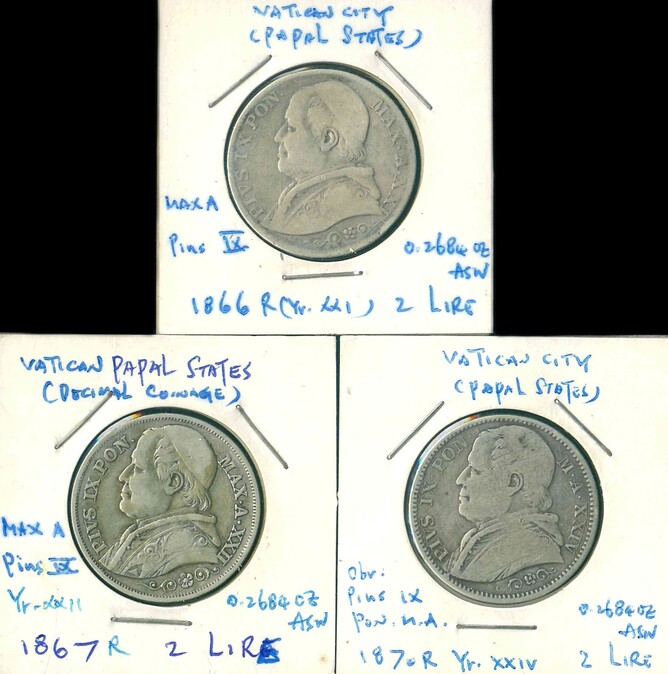 1866R/67R/70R Papal States (教皇國) 2 Lire F/VF 編號:NIL(共3枚)