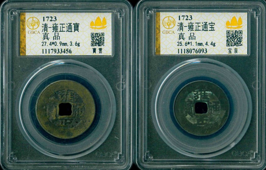 1723 清-雍正通寶 (寶泉/寶云) GBCA 真品 編號:1118076093…(共2枚)