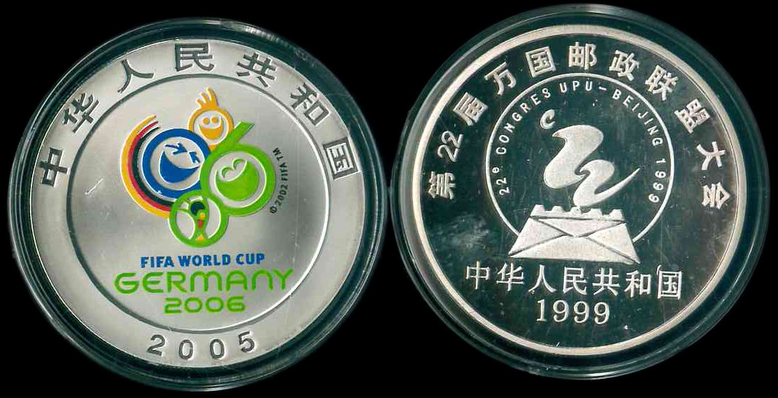1999/2005 中華人民和國 (萬國郵聯/世界盃足球賽 2x1oz Ag) $10 Proof 編號: NIL(共2枚)