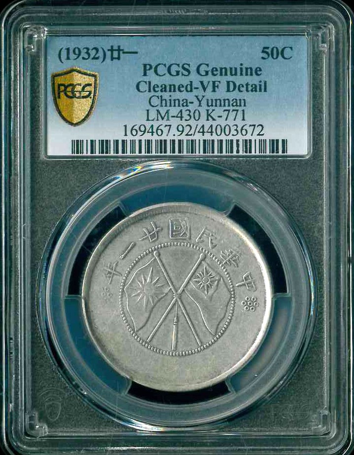 1932 中華民國21年雲南省造半圓銀幣三錢六分 PCGS VF Detail 編號:44003672