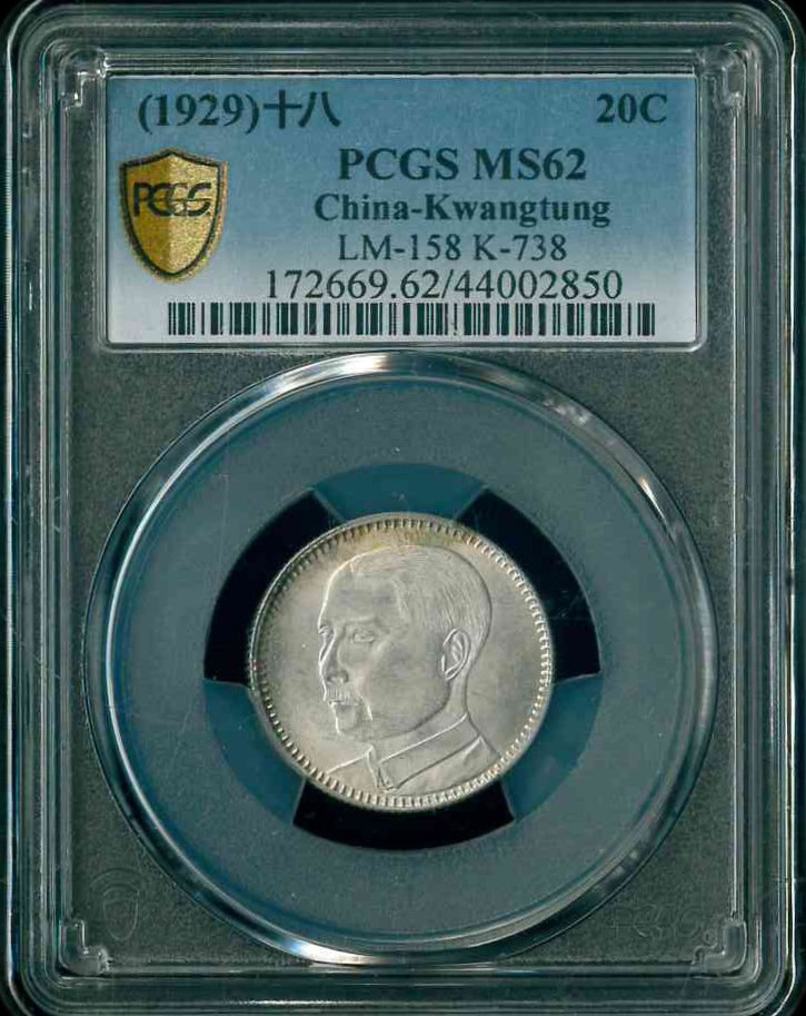 1929 中華民國18年廣東省造2毫 PCGS MS62 編號:44002850