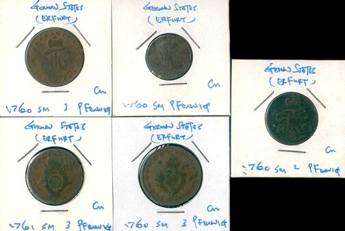 1760SM 德國 (Erfurt) 1,2,3 Pfennig F 編號:NIL(共5枚)