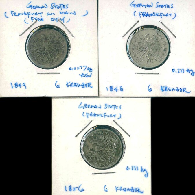 1848/49/56 德國 (Frankfurt) 6 Kreuzer VF/XF 編號:NIL(共3枚)