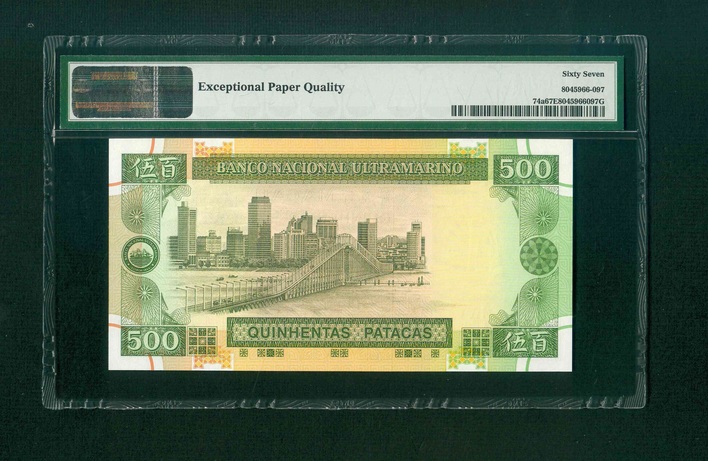 1999 澳門大西洋銀行 500 Patacas PMG 67 EPQ 編號: MA90597(頂級雪白)