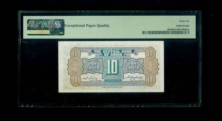 1931 中央銀行 壹角 PMG 66 EPQ 編號: G105437F(頂級雪白)