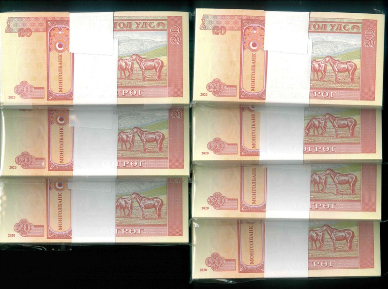 2020 蒙古 20 Tugrik UNC 編號: AP2515401…(共7刀各100張,頂級雪白)