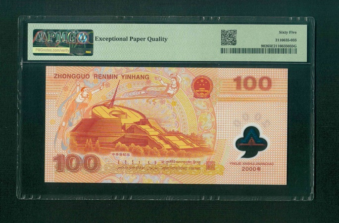2000 中國人民銀行千禧紀念鈔 $100 PMG 65 EPQ 編號: J03280340(頂級雪白)