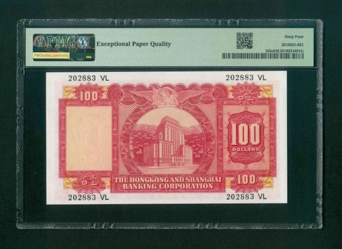 1971 香港上海滙豐銀行 $100 PMG 64 EPQ 編號: 202883 VL(頂級雪白)