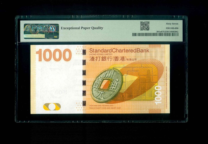 2010 香港渣打銀行 $1000 PMG 67 EPQ 編號: AA192555(頭版豹子號,頂級雪白)