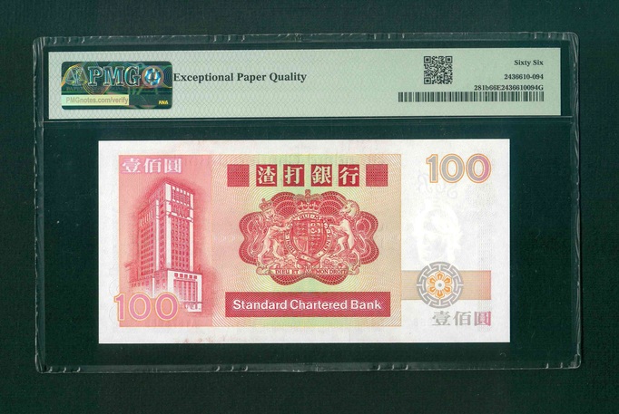 1987 香港渣打銀行 $100 PMG 66 EPQ 編號: AT875956(頂級雪白)