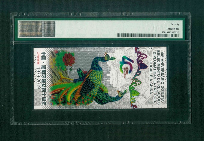 1979-2019 中國/葡萄牙建交40周年銀片紀念(5g.999 Silver) PMG 70* 編號: ZP656888(星標,頂級雪白)