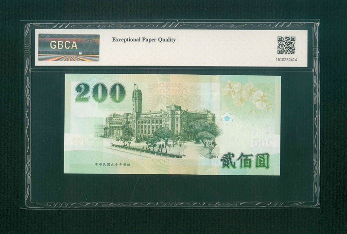 2001 台灣中央銀行$200 GBCA 67 EPQ 編號: EP297067YJ(頂級雪白)
