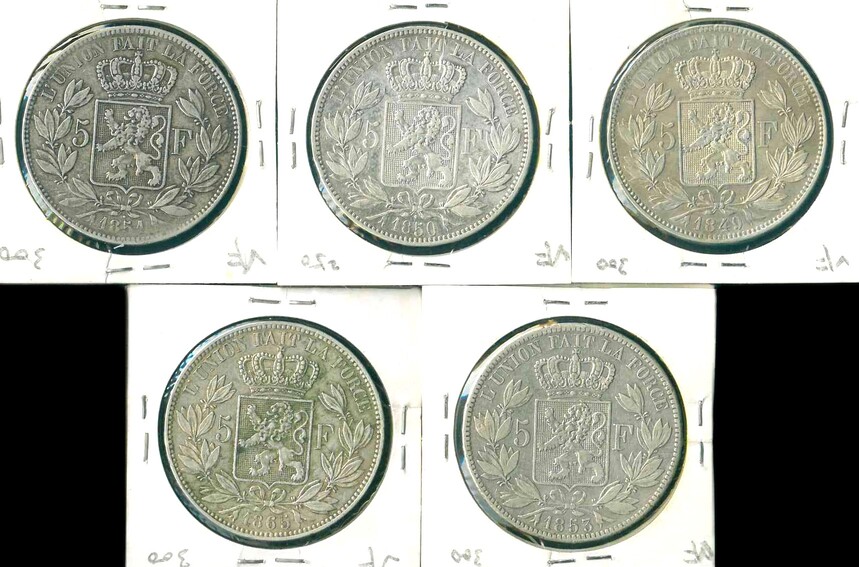1849-65 比利時 5 Francs (不同年份) VF 編號: NIL(共5枚)