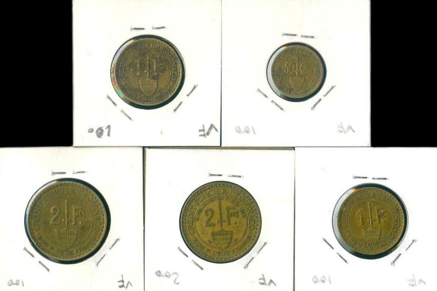 1924 摩納哥 5 Cents, 1F, 2F (不同) VF 編號: NIL(共5枚)