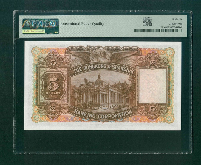 1941 香港渣打銀行 $5 PMG 66 EPQ 編號: Q137527(頂級雪白)